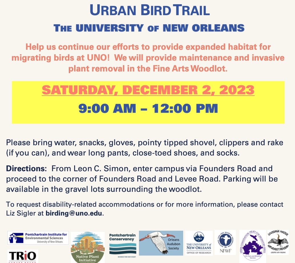 SATURDAY, DECEMBER 13, AND SUNDAY, DECEMBER 14 11:00 a.m.-1:00 p.m. Prepping and Planting at Washington Square Park (700 Elysian Fields Avenue, New Orleans) Join the Faubourg Marigny Improvement Association and New Orleans Parks and Parkways to prep on Saturday, plant on Sunday, and create a native plants showplace in […] |
